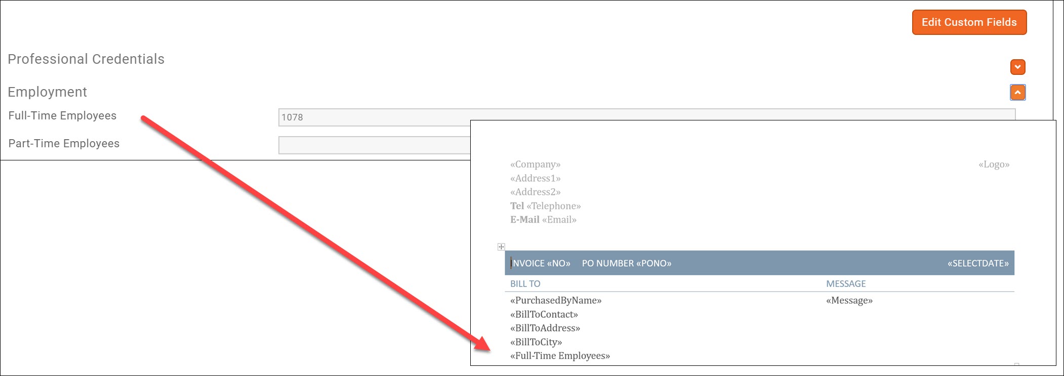 For further customization of your invoices, business and individual Custom Fields (those displayed on the More Info tabs) may be added to your documentation templates.
