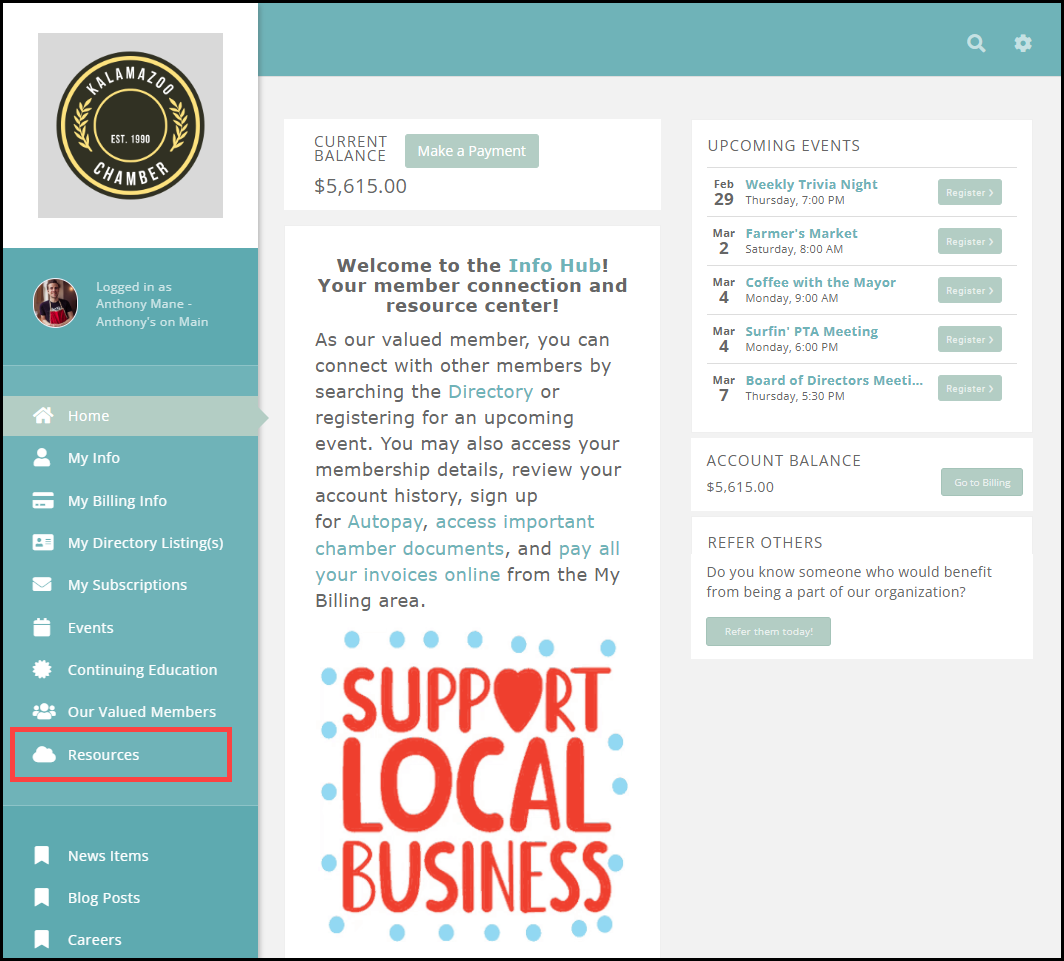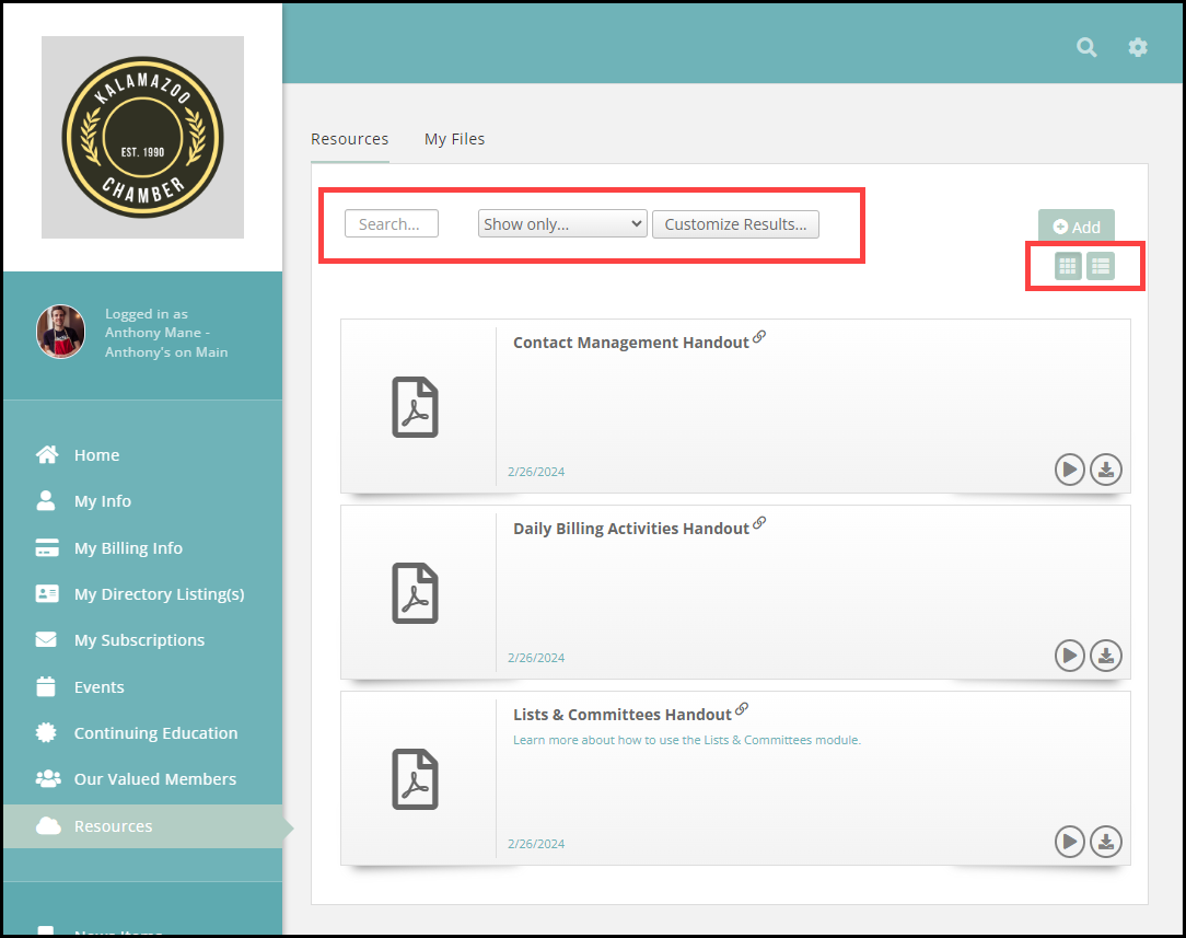Members must have View access to the Info Hub to see available resources. Additionally, if resources have been limited to particular groups (optional), the members will only see the resources if they belong. See Add Resources to the Info Hub for further instructions.