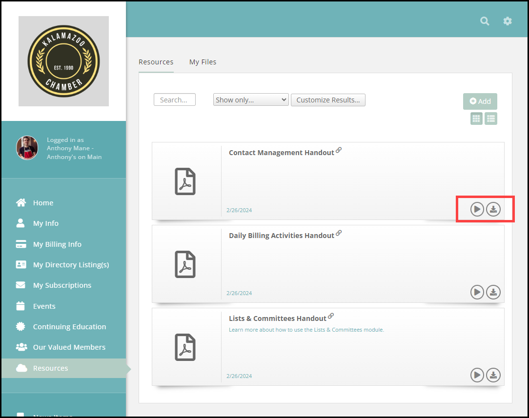 Each Resource will have a Preview icon and a Download icon. Clicking the Preview icon allows you to view the Resource before downloading it. File types that will display a preview are: .pdf, .doc, .docx, .xlxs, .xls, .txt, .cvs.
