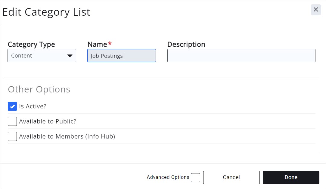 - Select the Is Active check-box to enable use of this list. If you no longer wish to use a category list, best practice is to de-activate the list.