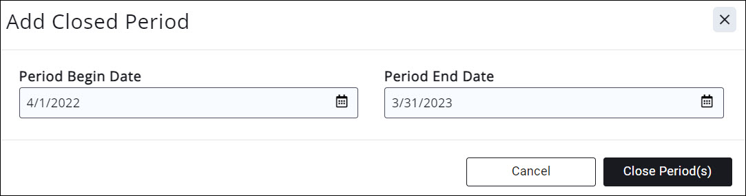 - Period Begin Date: This will default to the day after the last period closed. For example, if the last period closed on March 31, the Period Begin Date will default to 4/1