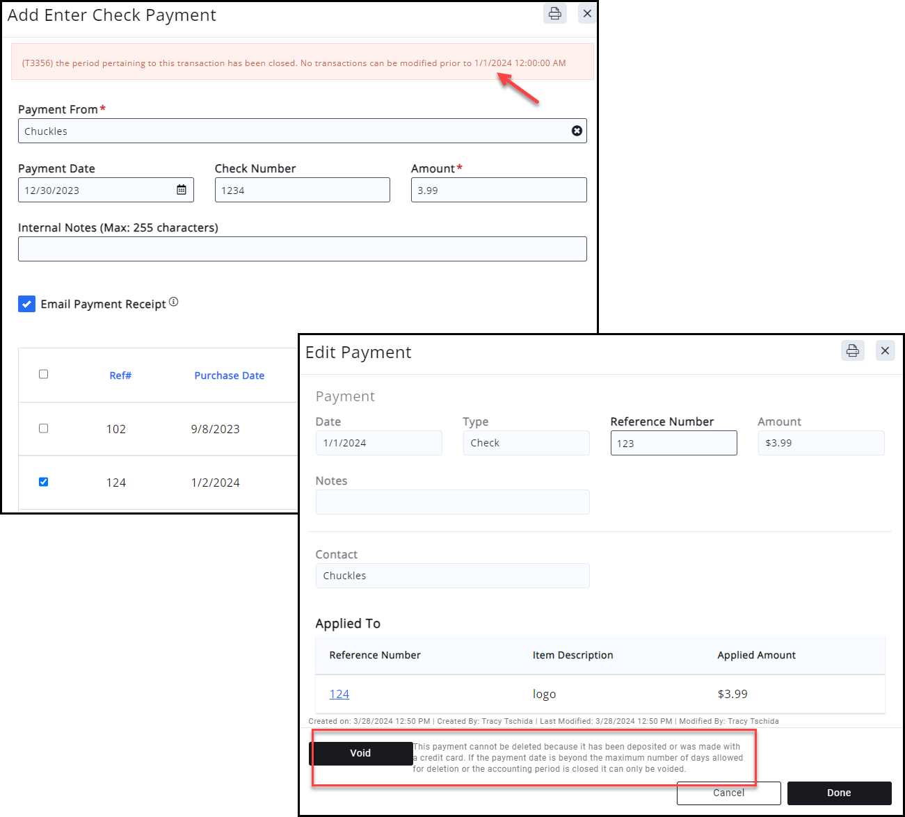 If needed, a closed period can be reopened to correct past transactions or to create a refund: