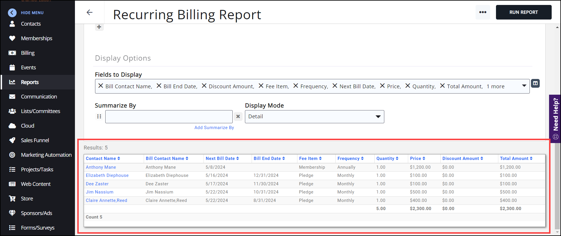 The Recurring Billing Report will provide you with a list of Scheduled Billing configured for your contacts. This will include all schedules, not just membership.