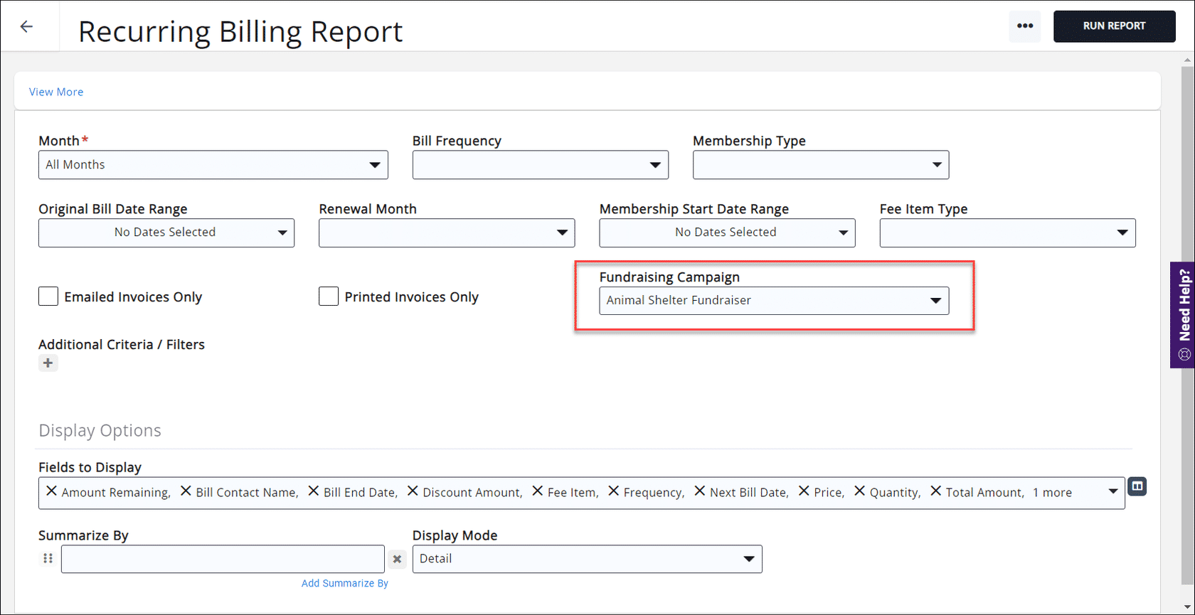 - You use the Recurring Billing Report filtered to a single campaign or to view all recurring contributions. In the screenshot below we are looking for just those that are for the Animal Shelter Fundraiser.