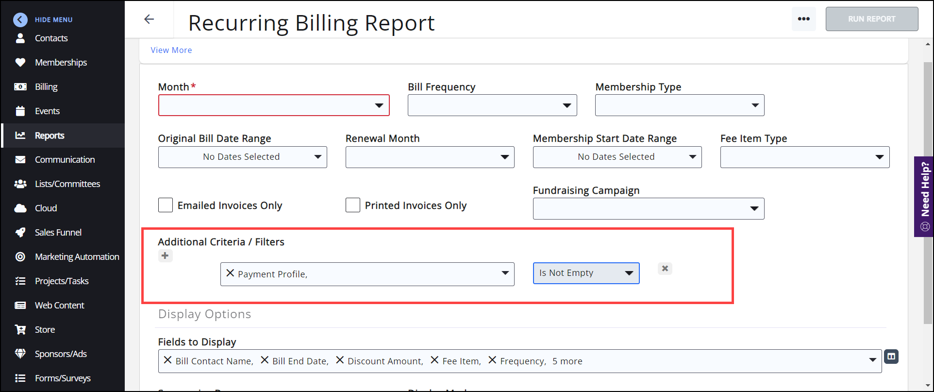 Select Display Options. The system is set up with default fields to display in your report. You may add and/or remove fields by clicking on the Fields to Display dropdown arrow. To view the Autopay profile criteria, add Payment Profile by clicking on the dropdown arrow.