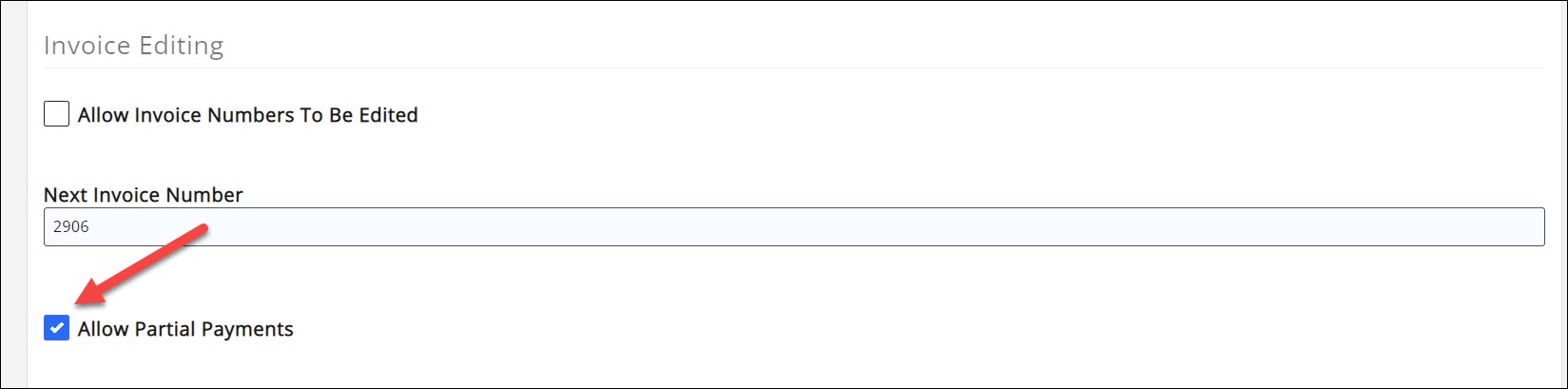 - In the Invoice Editing section, select the Allow Partial Payments check-box.