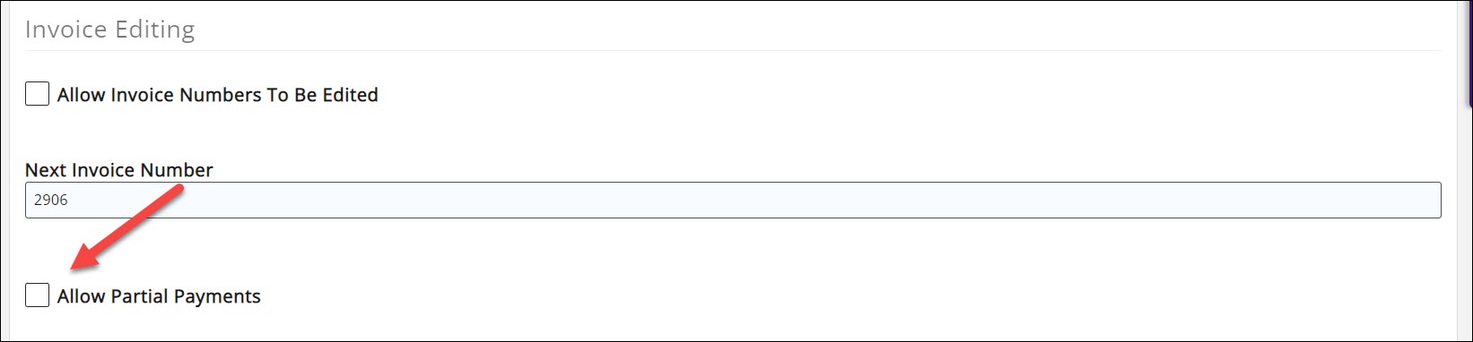 - In the Invoice Editing section, deselect the Allow Partial Payments check-box.