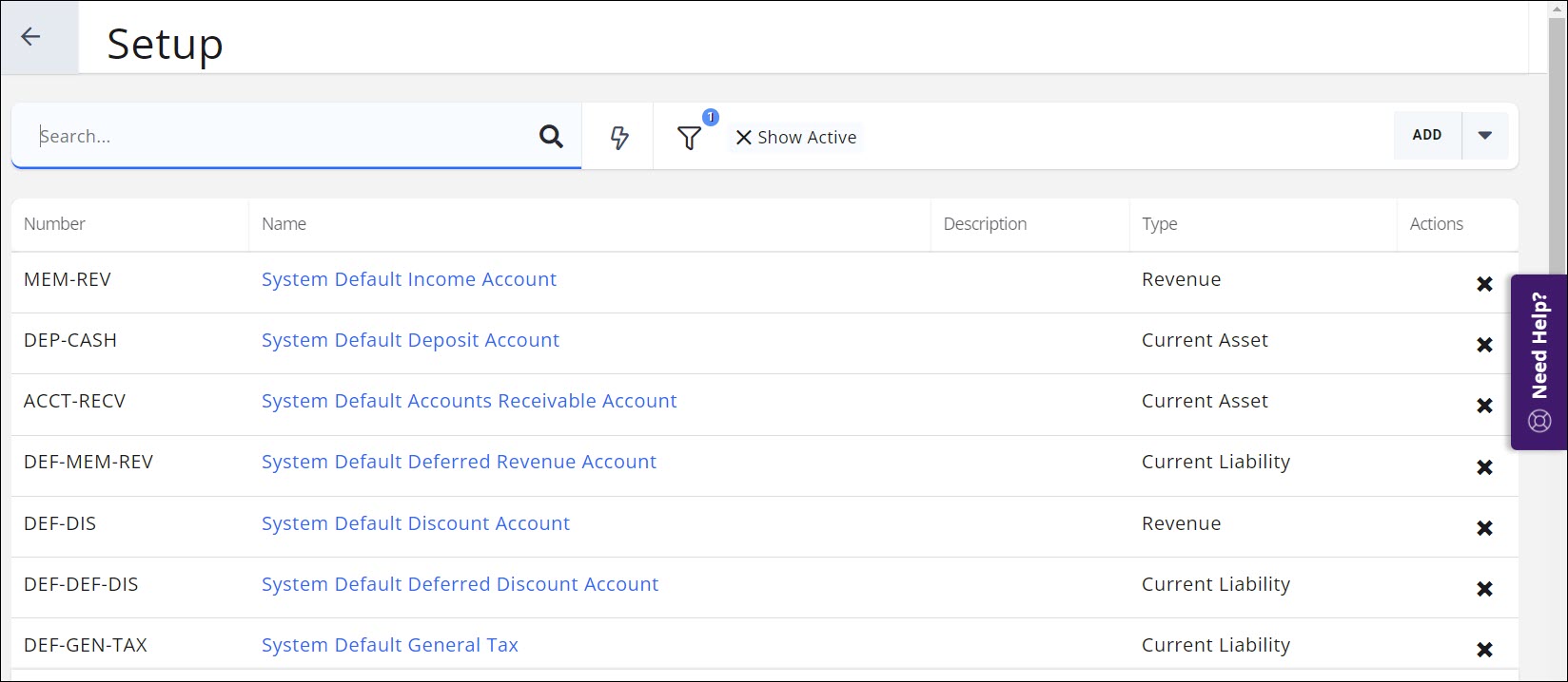 - Click Chart of Accounts in the Finance section. A list to the accounts currently configured in your system will be displayed.
