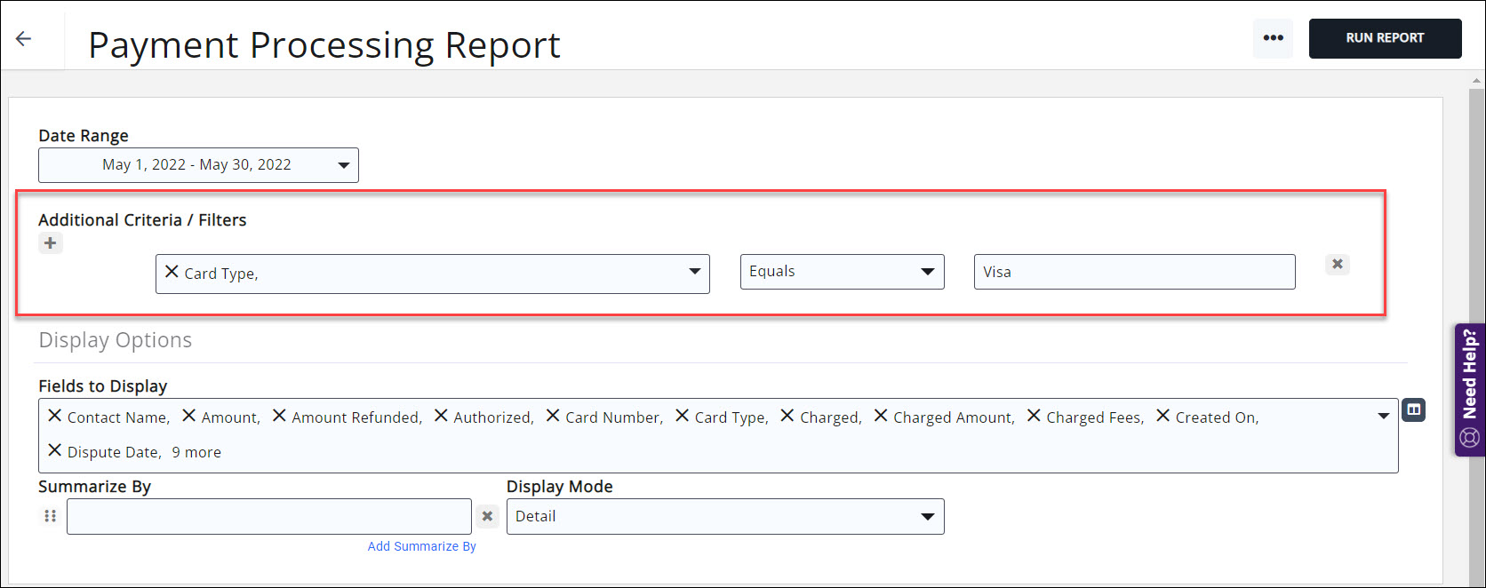 - Select your search filtering criteria. For example if you are looking for only Visa transactions add filters as shown in the screenshot below.