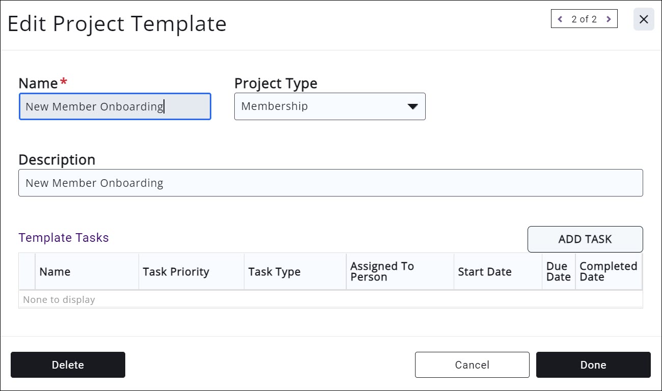 Project templates can be created for projects that are repeatable, such as New Member Onboarding, Member Acquisition, Events, etc. You can then use these templates and customize them as needed when you create new projects.