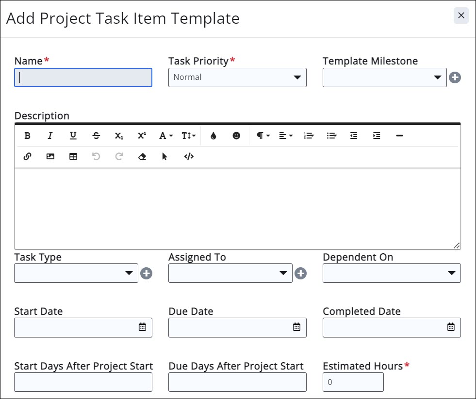 - Assigned To: You may select a staff member from the drop-down list, or simply leave this field blank. When you use the template for a project, you will have the opportunity to select the staff member to which you wish to assign the task.