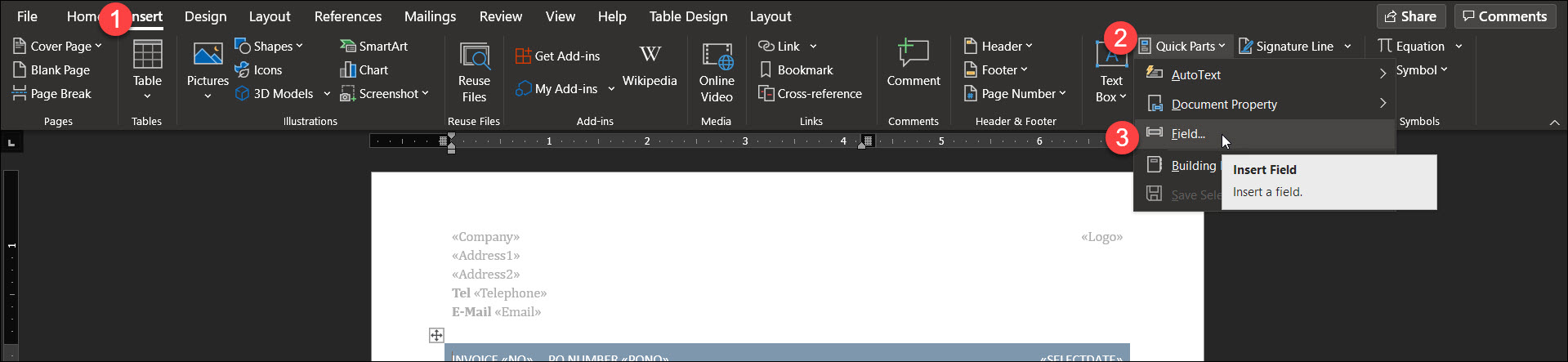 - Find the "Quick Parts" option and select "Field".