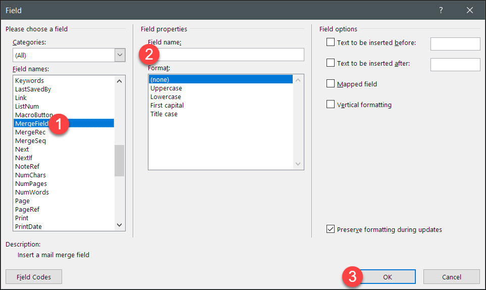 - In the "Field Names" selector, choose "MergeField".