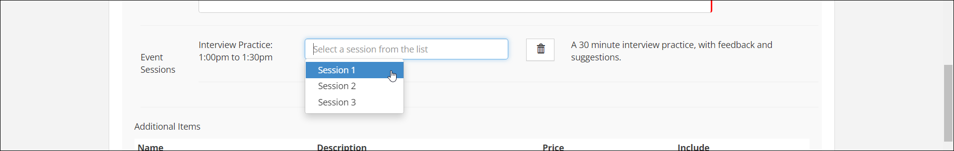 - Description: Enter a description for the session. (Optional; this will display to the right of the session when it is selected on the registration form.)