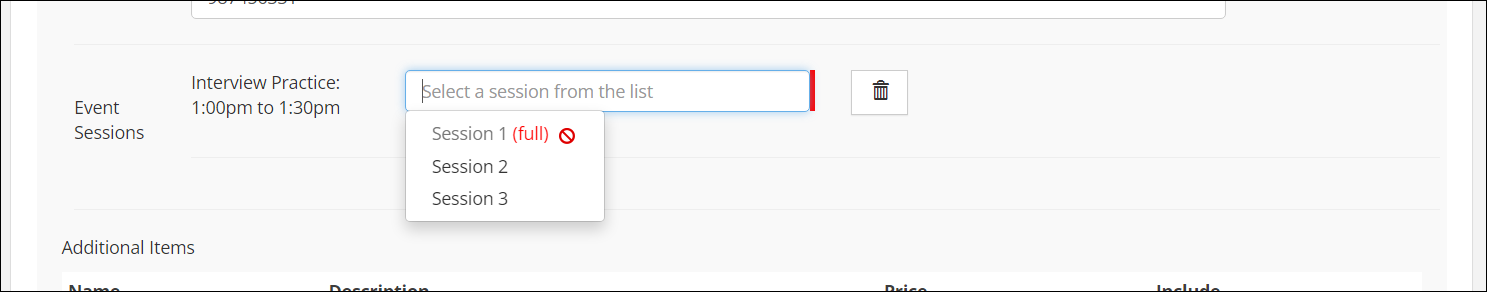 At this point our registrations are ready to go! On the event registration page, anyone who selects the appropriate registration type will be able to select a session to attend; being as we have the limit set to 1 for each session, that session will be considered full and will no longer be available for the next registrant to select.