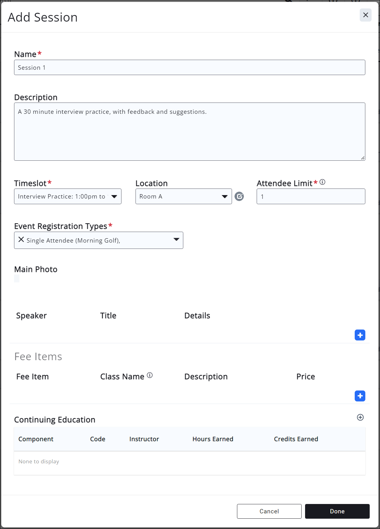 - Main Photo: Upload a photo for this session. For example, if this is a session for a conference, you may wish to upload a photo of the speaker.