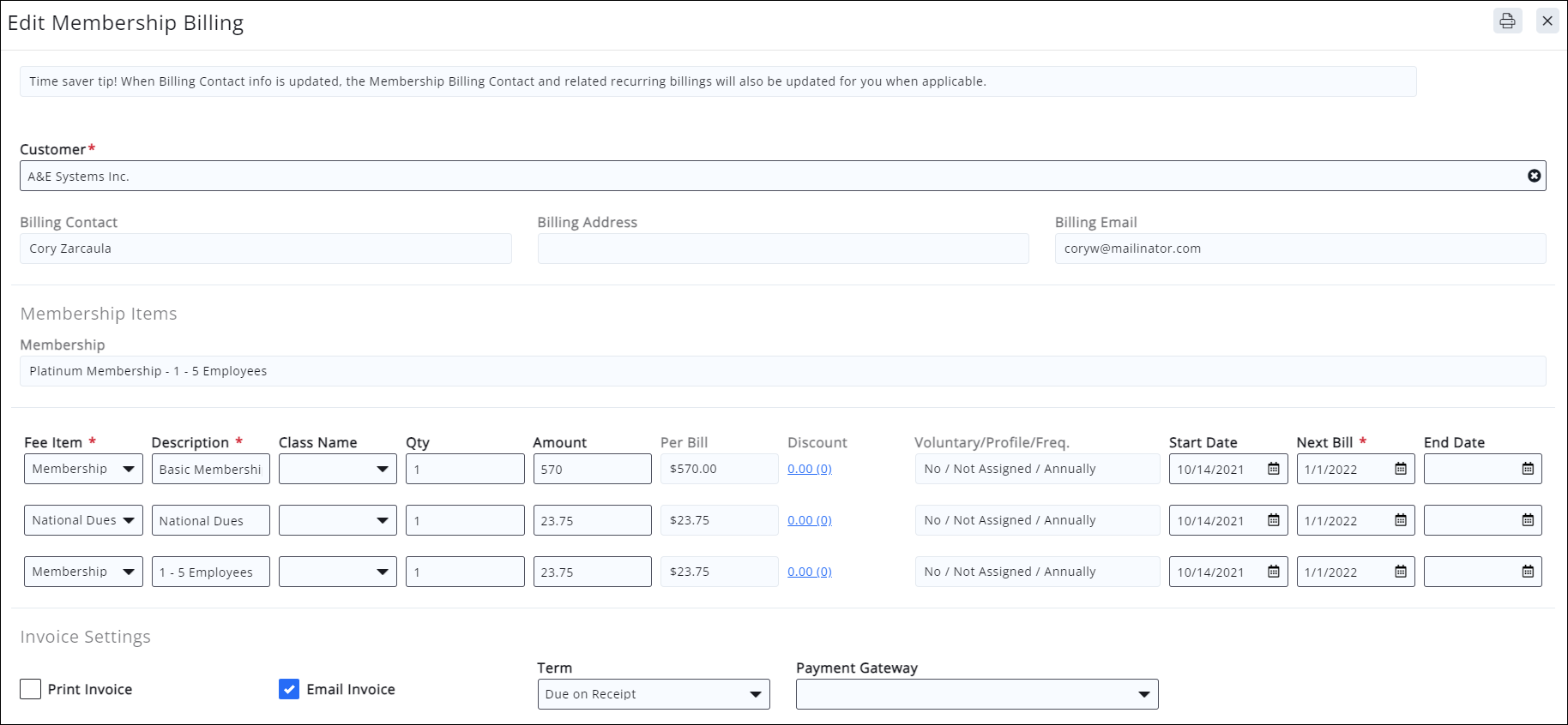 Membership Scheduled Billing will be automatically created when a membership is added to a contact. NOTE: If the membership includes multiple fees, these are not displayed individually in the schedule, but you can review them by clicking into the membership hyper-link.