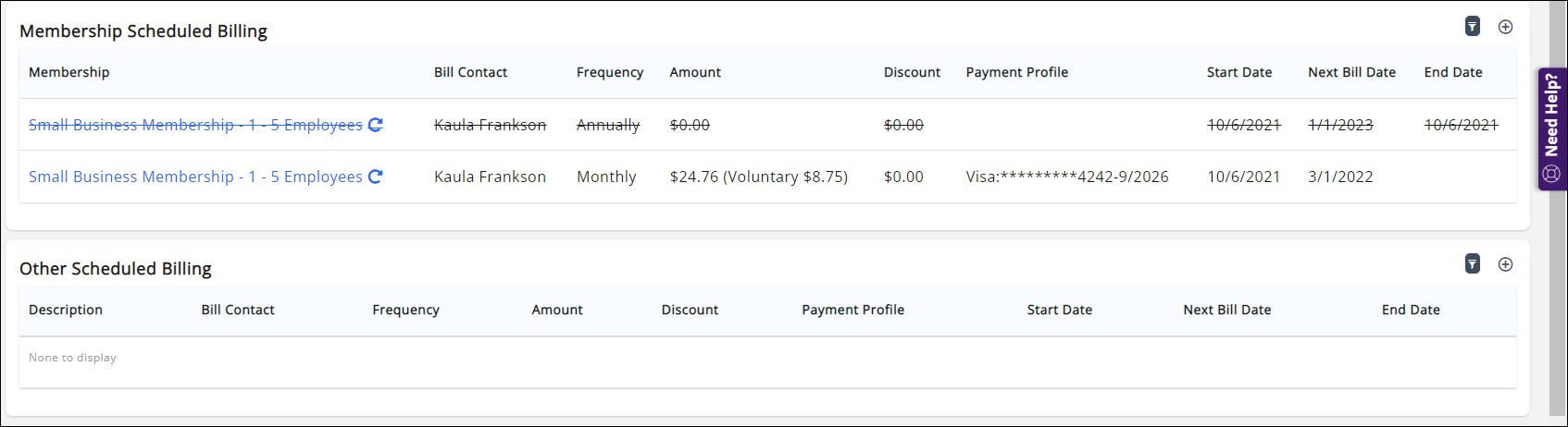 The recurring fee schedules for a contact can be viewed in the Membership Scheduled Billing section of the contact's Billing Setup tab. Two sections are displayed for recurring fees: Membership Scheduled Billing and Scheduled Billing.