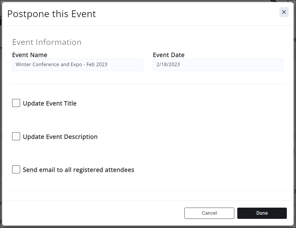 - If you wish to update the event title, select Update Event Title. By default, ***Postponed*** is appended to the event title. You can edit this if needed.