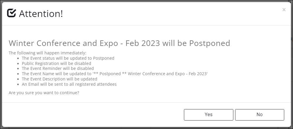 - If Yes, your choices will be activated, and the status of the event will be updated to postponed, the event reminder (if applicable) will be disabled, and on-line registration will be disabled.