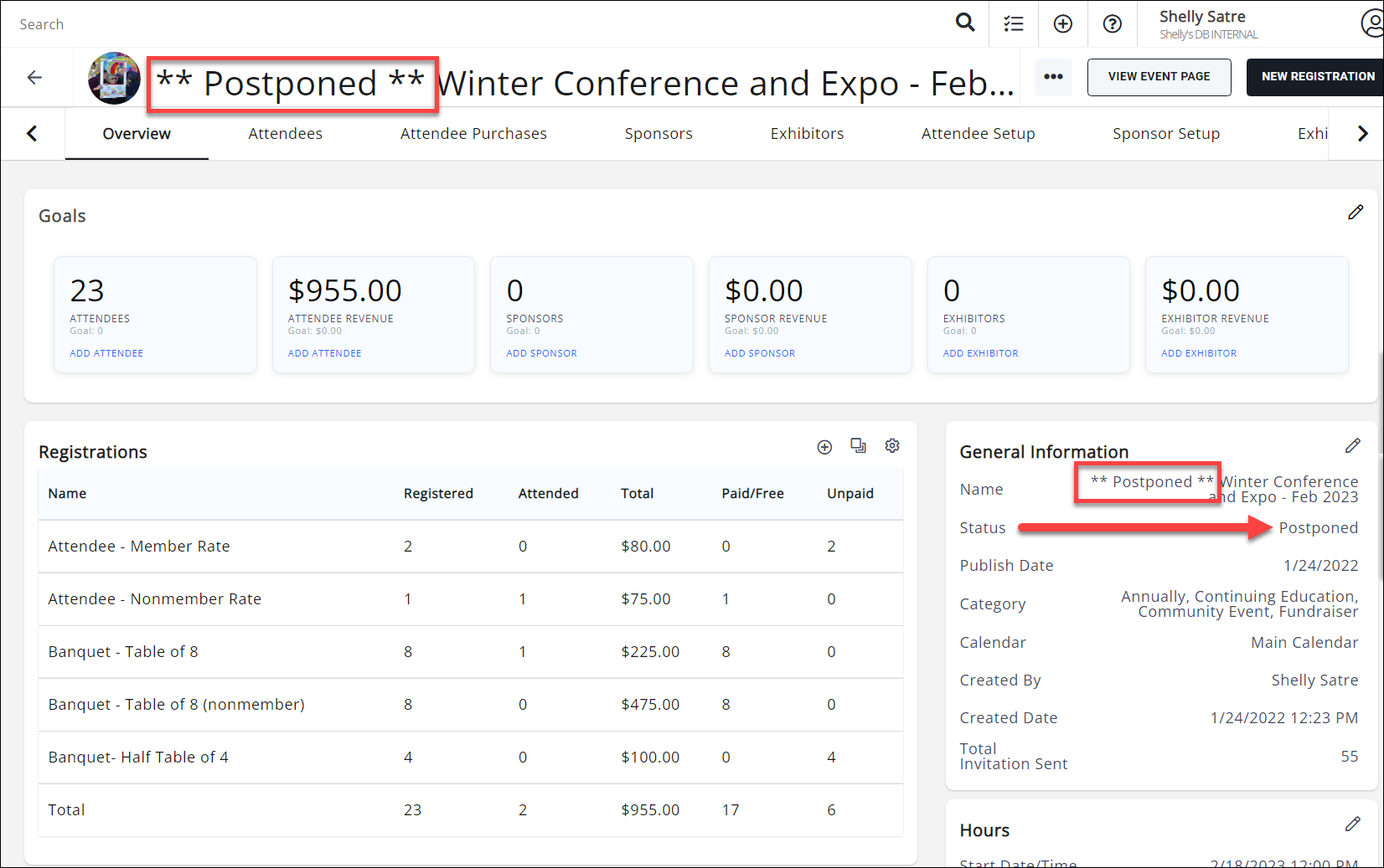 NOTE: Registrations are NOT cancelled, allowing you to retain the registrations if or when you update the date of the event. |