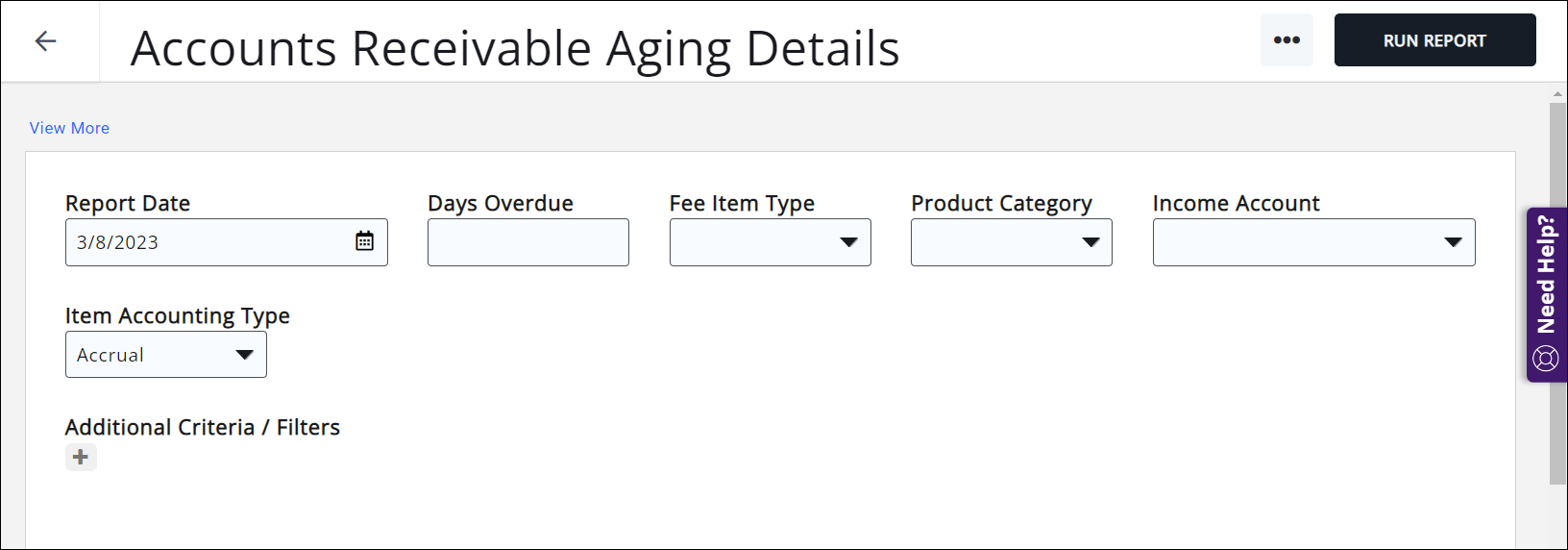 - Optional - Enter a Search/Filter query. For example, if you want to filter the report results to just receivables that are more than 90 days old, you would select Aging as filtering criteria.