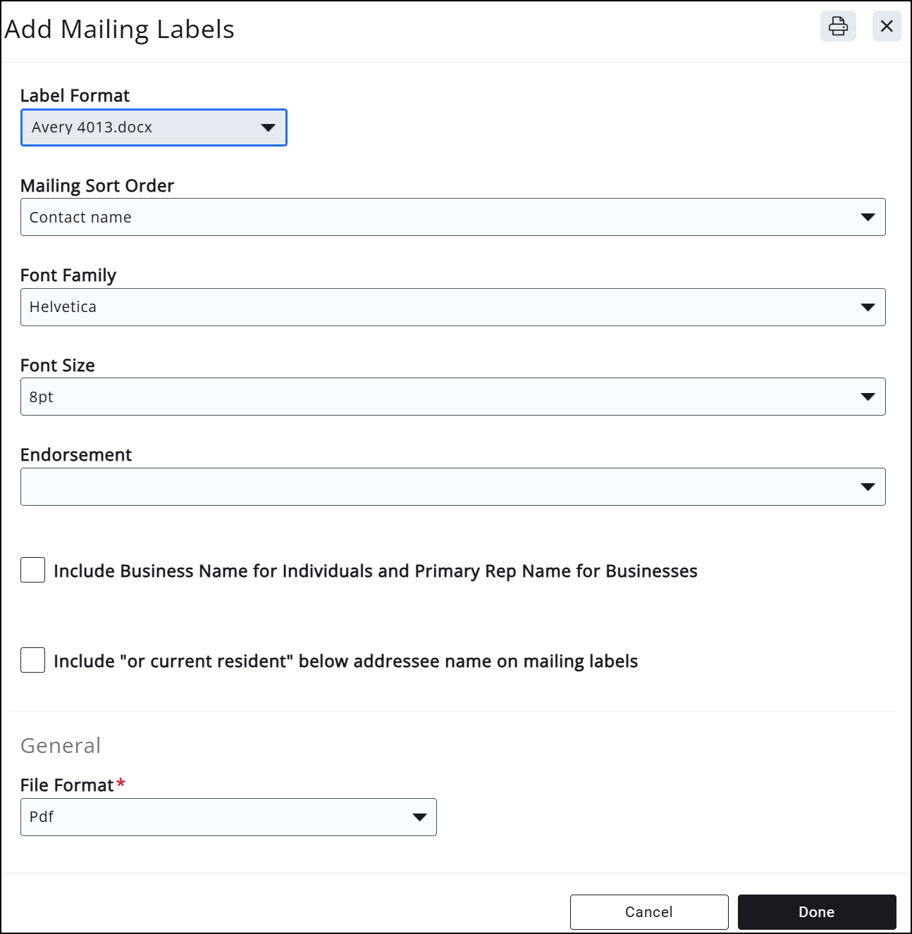 Mailing Label edit screen - Click Done.