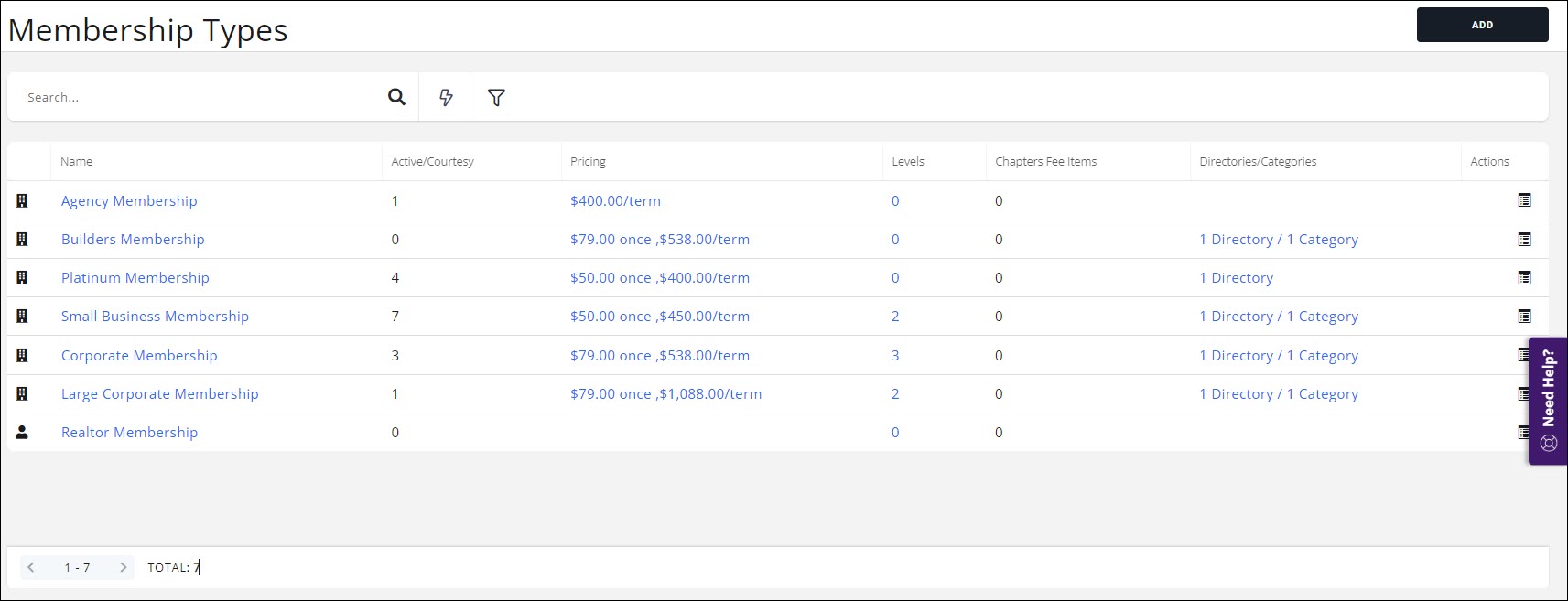 - Click Types in the Memberships section. A list of membership types currently setup in your system will be displayed