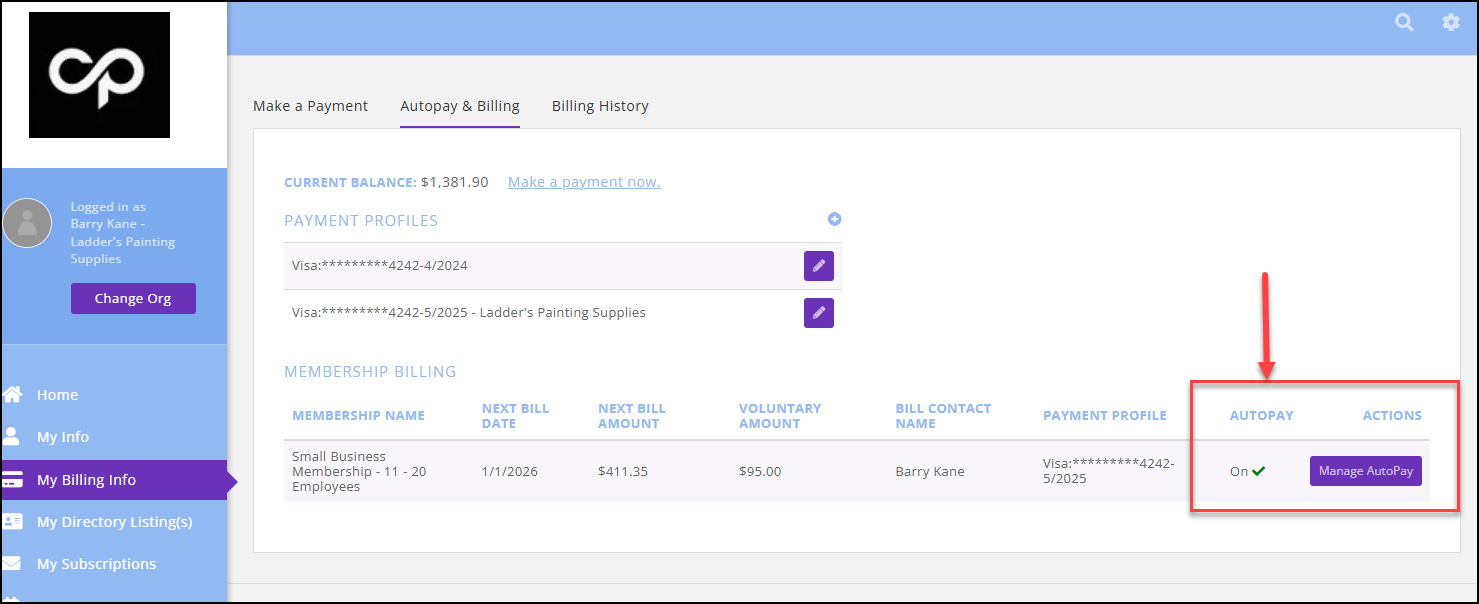 All member billing information is contained in the My Billing Info section of the Info Hub. If you do not see a My Billing Info link in the left navigation panel, everything will display on the Billing tab of the My Info section. Please consider enabling the new My Billing Info tab, as it is now the default for all GrowthZone Info Hubs.