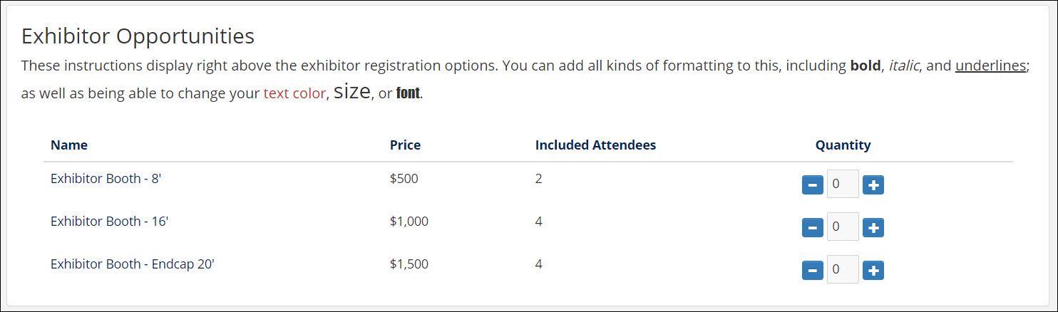 - Exhibitor Registration Instructions: these instructions will display right above the Exhibitor Registration options on the event registration form.