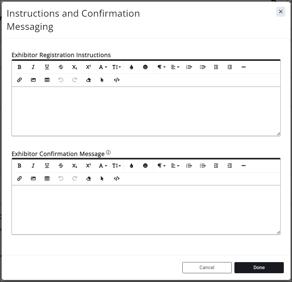 This will open the Instructions and Confirmation messaging window. You can edit two areas: the Exhibitor Registration Instructions and the Exhibitor Confirmation Message.