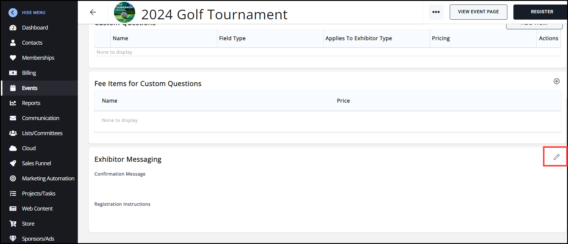 If you have exhibitor-specific registration instructions or wish to customize the confirmation page after exhibitor registration, on the event's Exhibitor Setup tab you can click the pencil icon in the Instructions and Confirmation Messaging section to customize those messages.