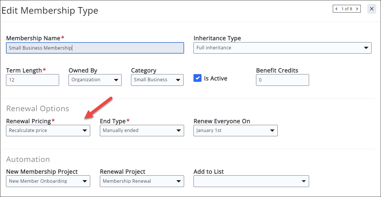 - Membership Type Renewal Pricing must be set to Recalculate Price.