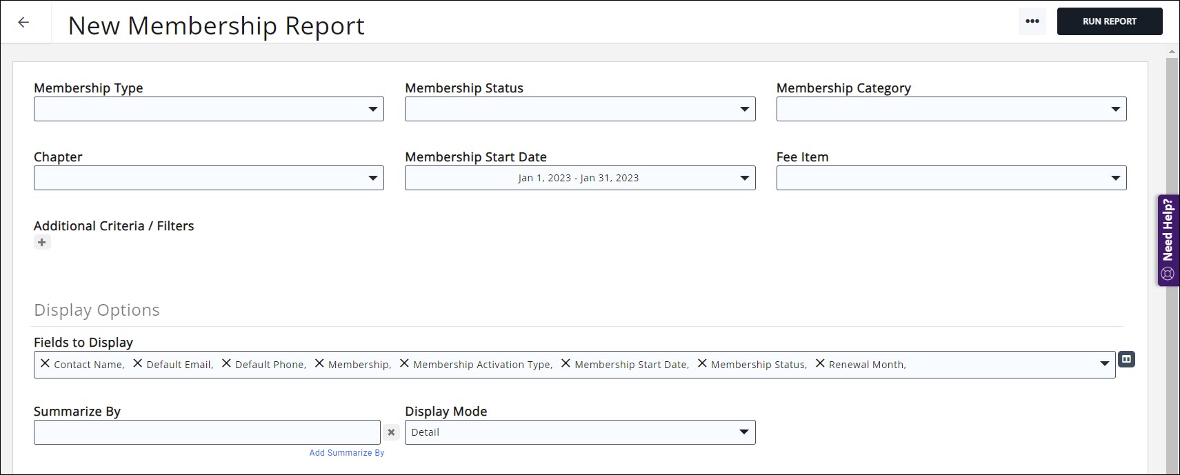- Select Summarize by criteria. This optional field allows you to select how you wish report results grouped. For example, you may choose to group results by membership type.