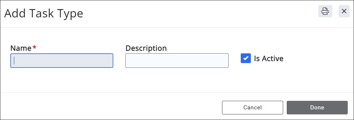 - Name - Provide a name for the task type. This is the name that will display when you are selecting tasks, and will be used for filtering and reporting purposes
