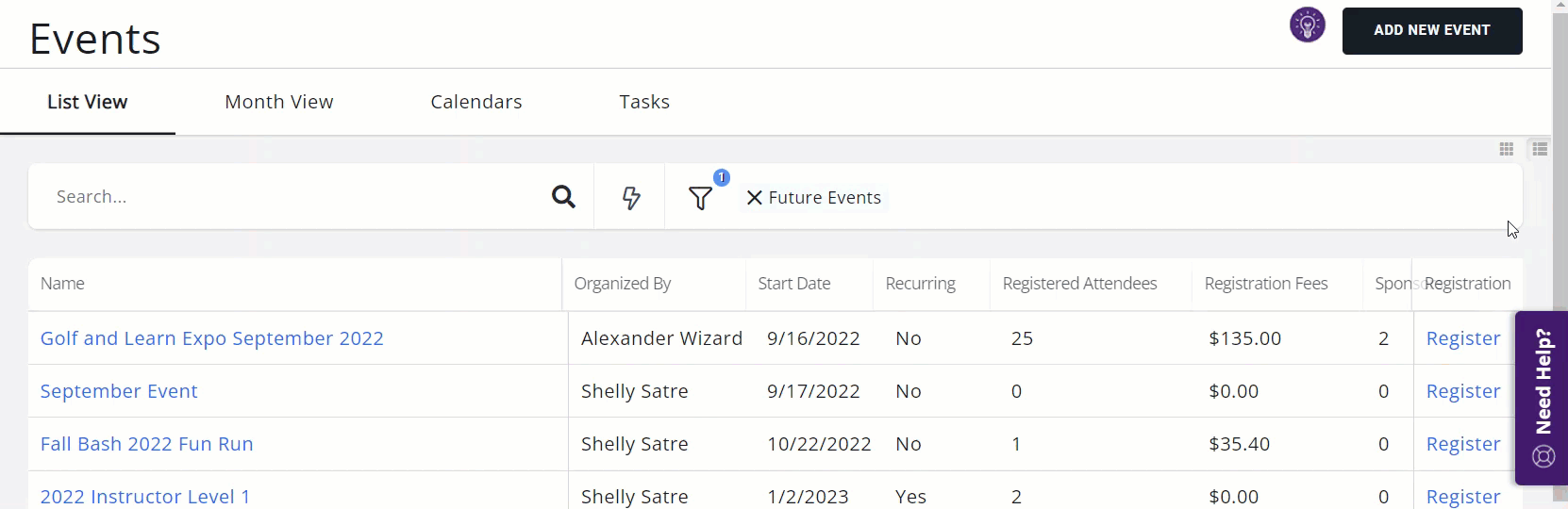 When you select events in the navigation panel all of your events will be displayed. You may view the events in list format or in card format by clicking the icons on the right-hand side of the screen.
