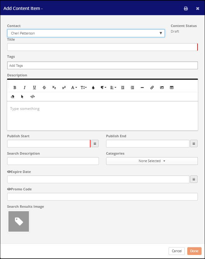 - Custom Fields: If you have included custom fields for you content list, complete them as desired. In the image above we have included the Expire Date and the Promo Code custom fields. These fields are default.