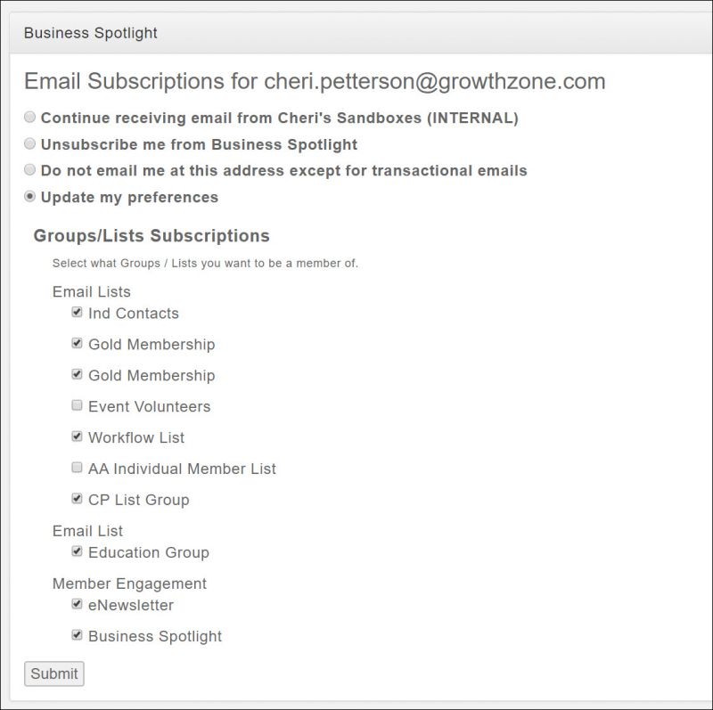 - Update my preferences: When this option is selected, the recipient will see a list of the groups that they are currently subscribed to. They can select or deselect the lists/committees that they wish to receive emails from. The recipients email address will be marked as Do Not Email for those groups de-selected.