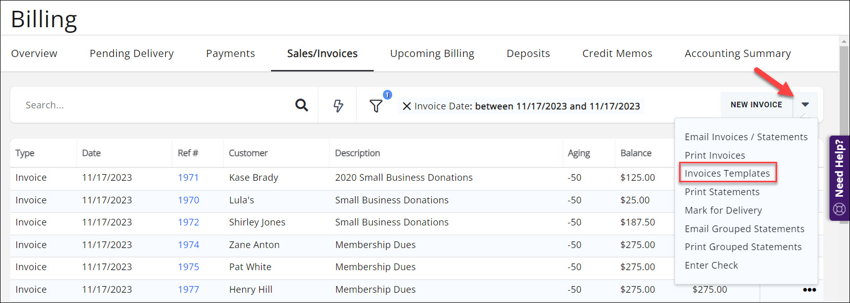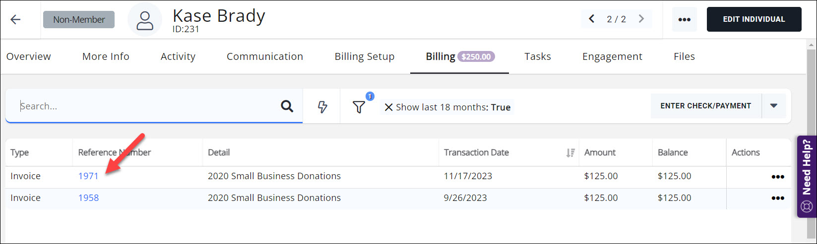 - Click the link for the desired invoice. You can find the invoice either on the contact's Billing tab or in the Billing Module on the Sales & Invoices tab.