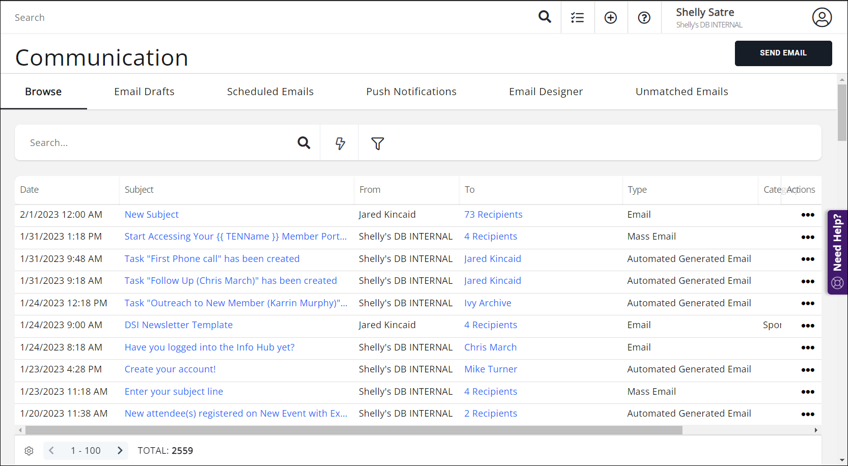 You may review and manage all communications in the Communications module. (Select Communications in the Navigation Panel). On the Communications module Browse tab, you will be able to review ALL communications. This list includes emails, notes and logged phone calls. You may easily search the list using the Search... field, use the Quick Filter to apply a single filter, or use the Customize Filter option