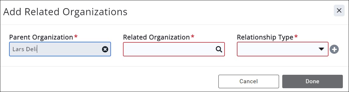 - Type in the Related Organization name. If the related organization exists in the database, the field will automatically populate. If the related organization does not exist in the database, you will first need to set it up as a contact prior to setting up the relationship.