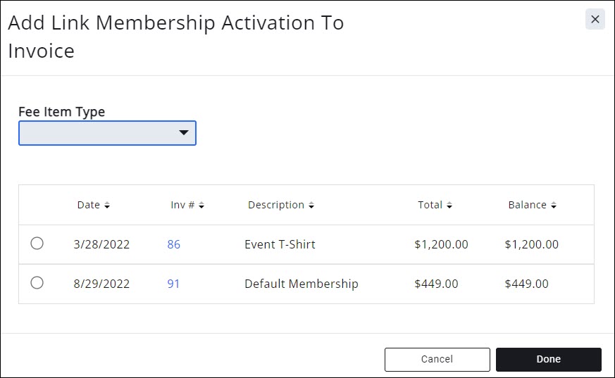 In rare cases, you may need to manually link an invoice to a membership activation. For example, an invoice was created prior to adding a membership or an invoice has been voided or deleted. To link an invoice:
