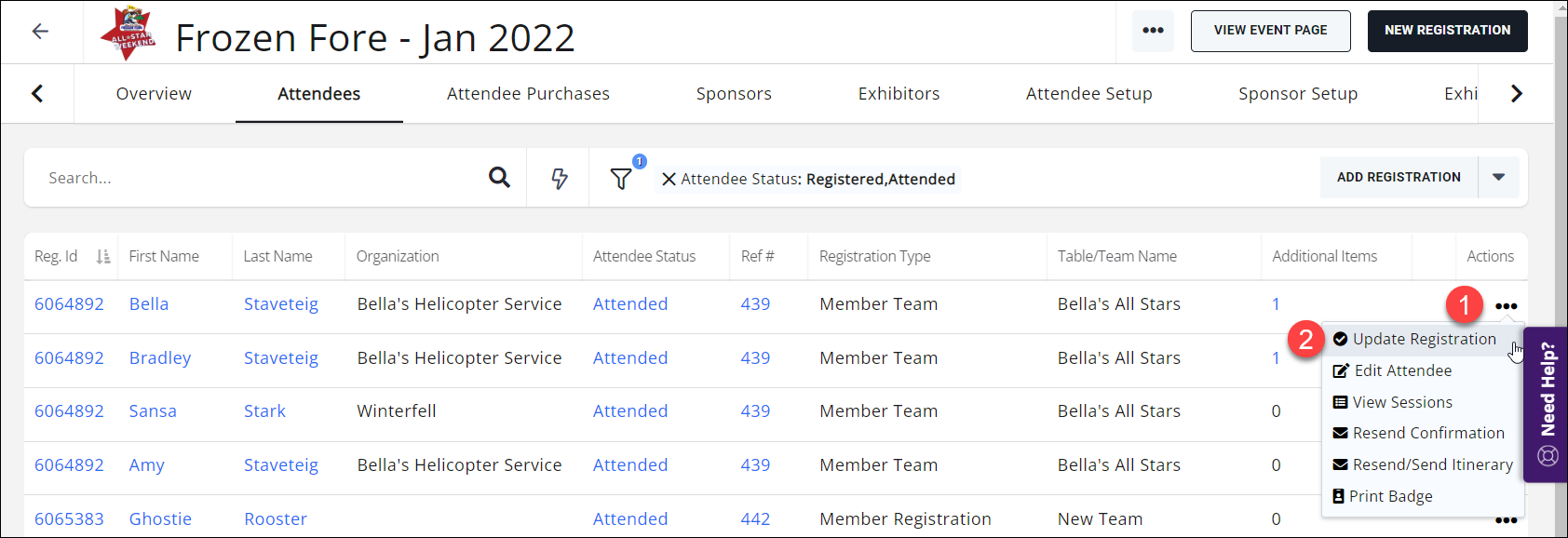 The Update Registration option allows staff to go to the attendee's registration form and add additional items or add registrations if needed.