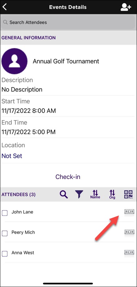 - Using the left hand navigation click into Events and choose the desired event. A money icon will be displayed next to any attendees who still must pay for registration