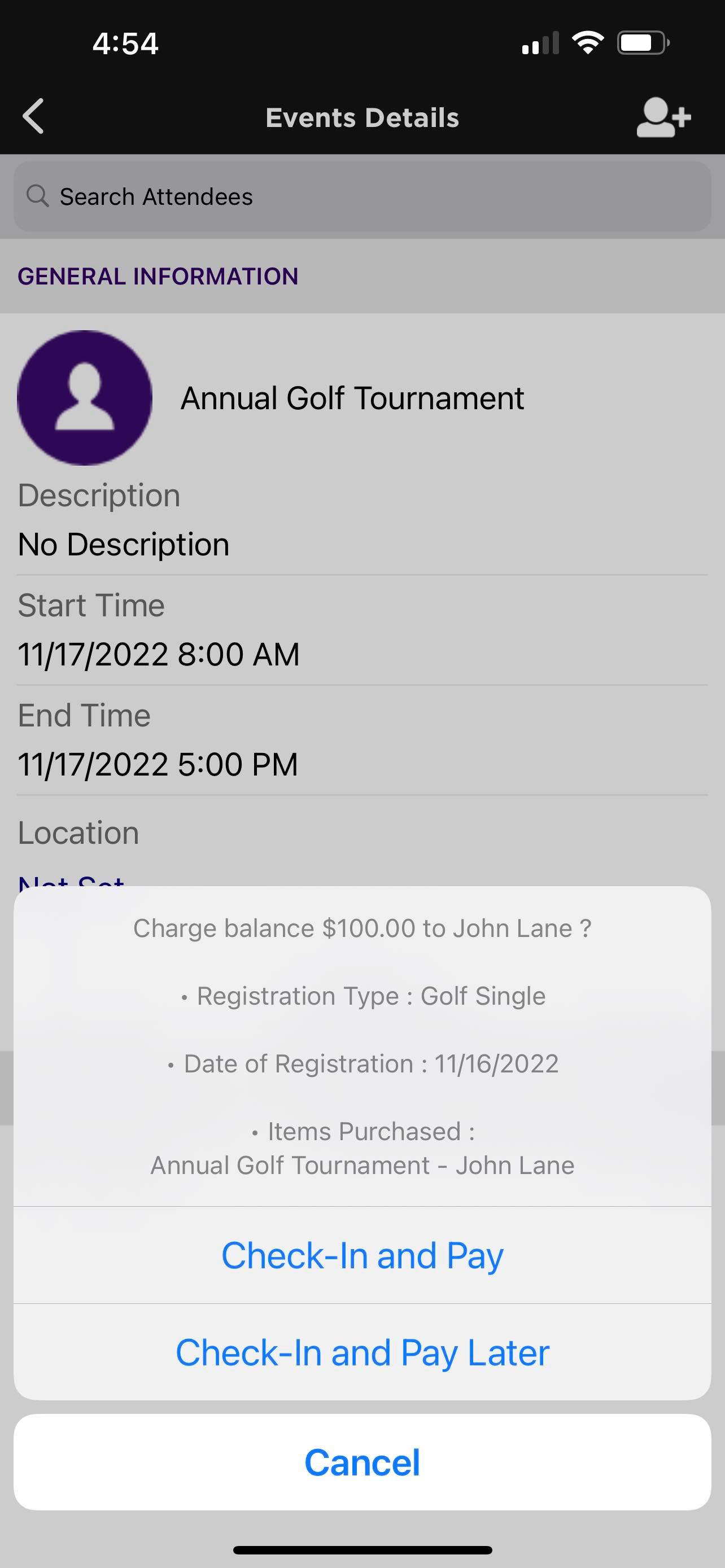 - Click the money icon. You will be prompted to Check-In and Pay or Check-In and Pay Later