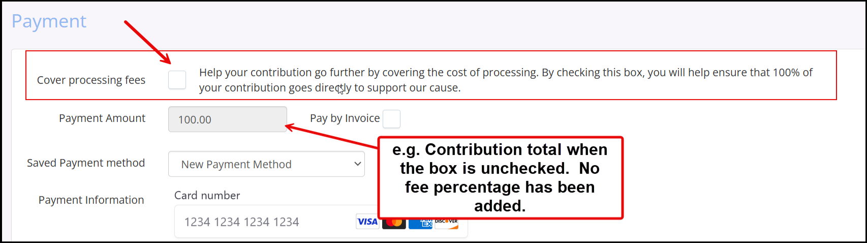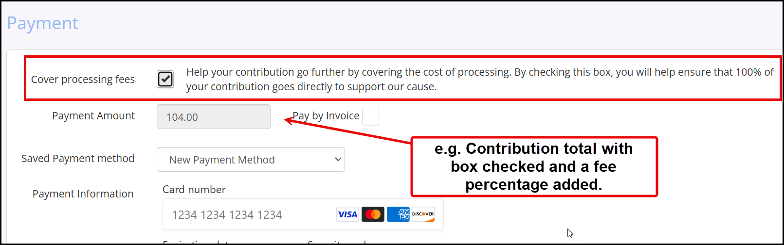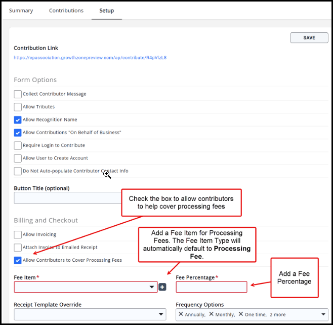 - Select the option to Allow Contributors to Cover Processing Fees.