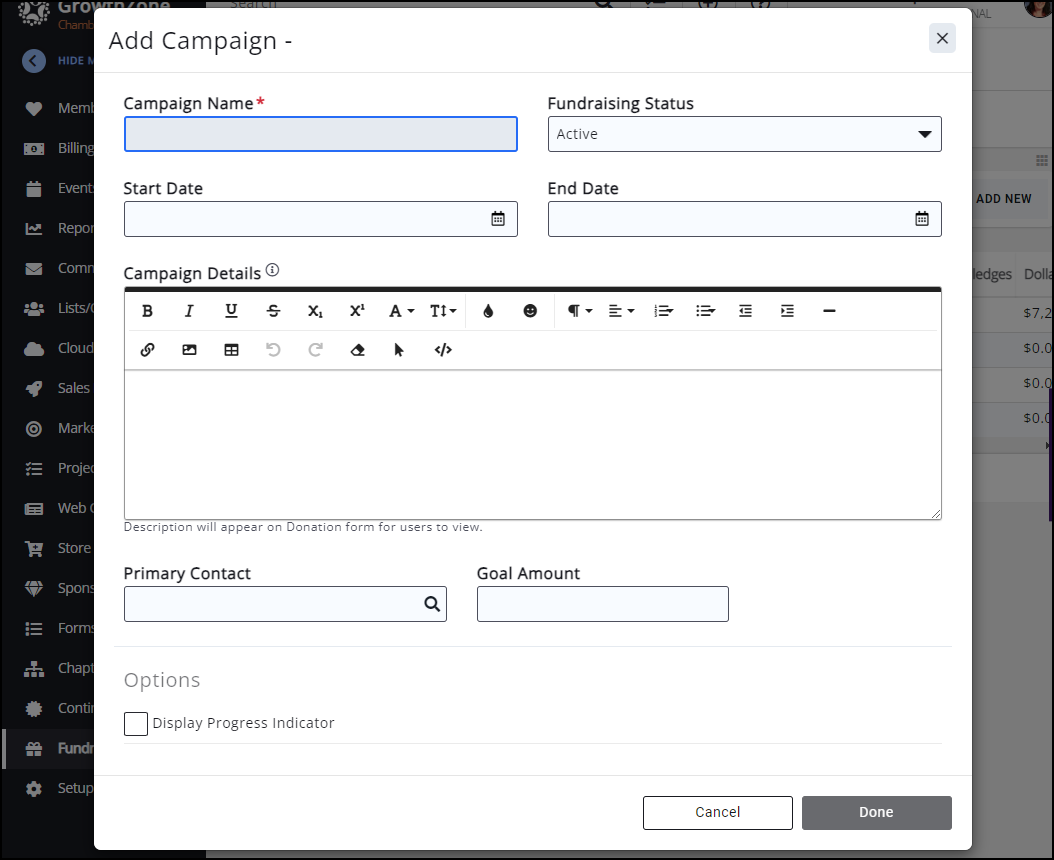 Campaign Details: Enter a description of the new campaign. The description will be displayed on the contribution form for users to view.