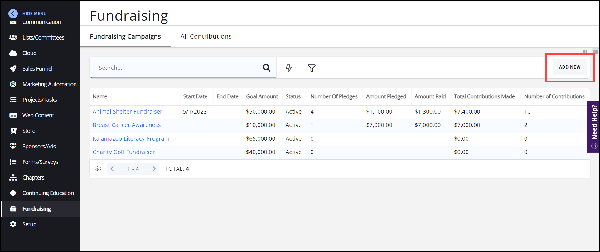 Click Fundraising in the Navigation Panel. The Fundraising module will display a list of all of your fundraising campaigns.