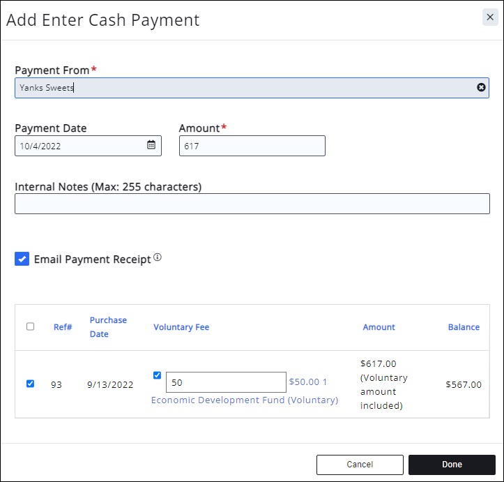 - Amount: Select the invoices to which the cash payment is to be applied; the amount will automatically total. You may change this if necessary.