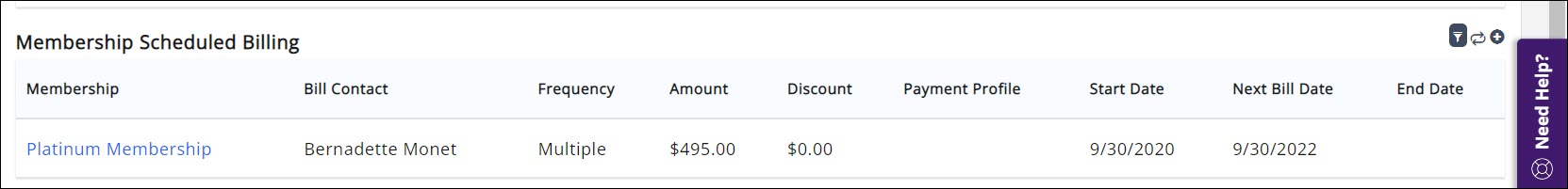 For the desired member, click the Billing Setup tab. All recurring billing for the member will be shown in the Membership Scheduled Billing section. You can filter to active and inactive by clicking the icon.